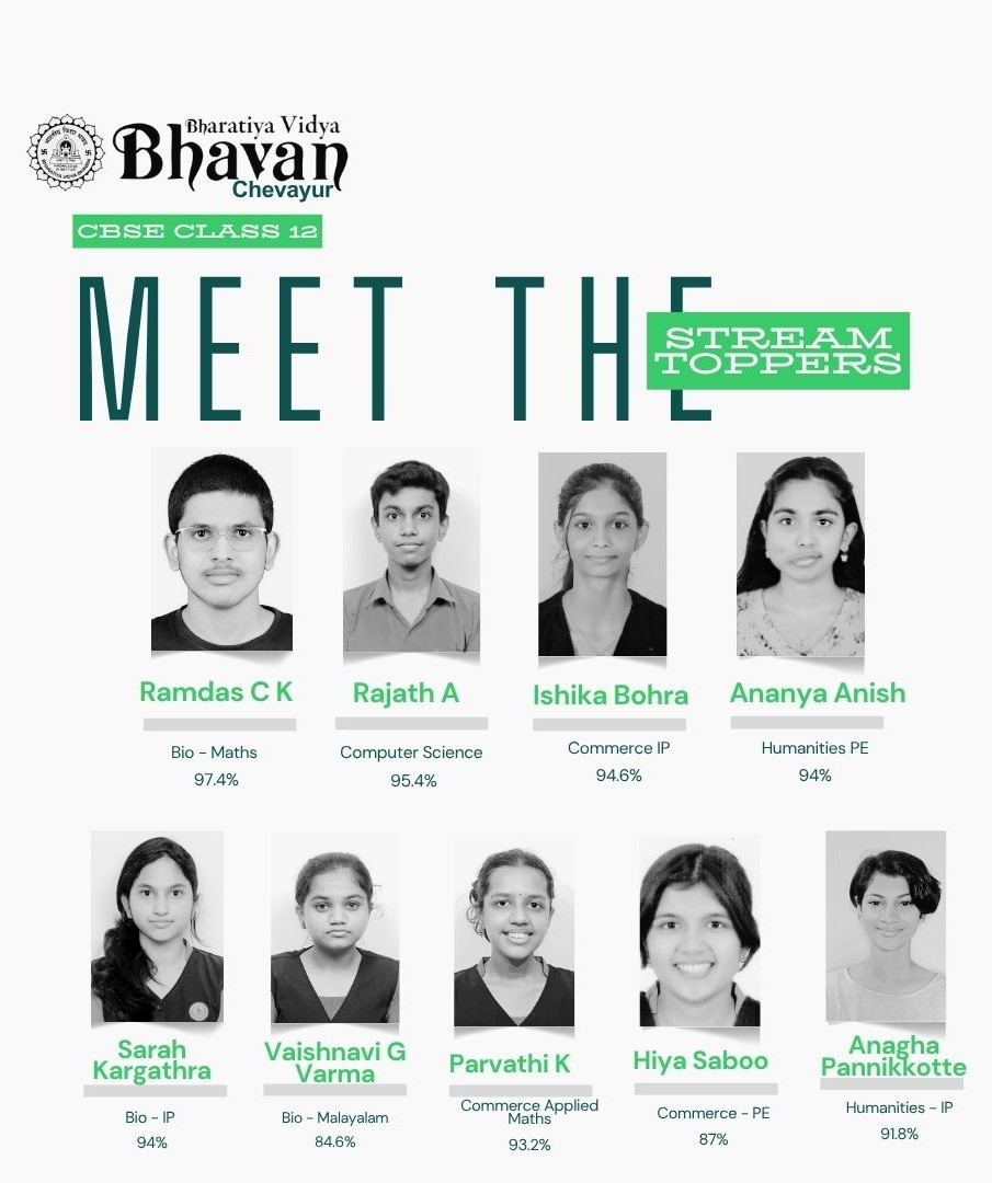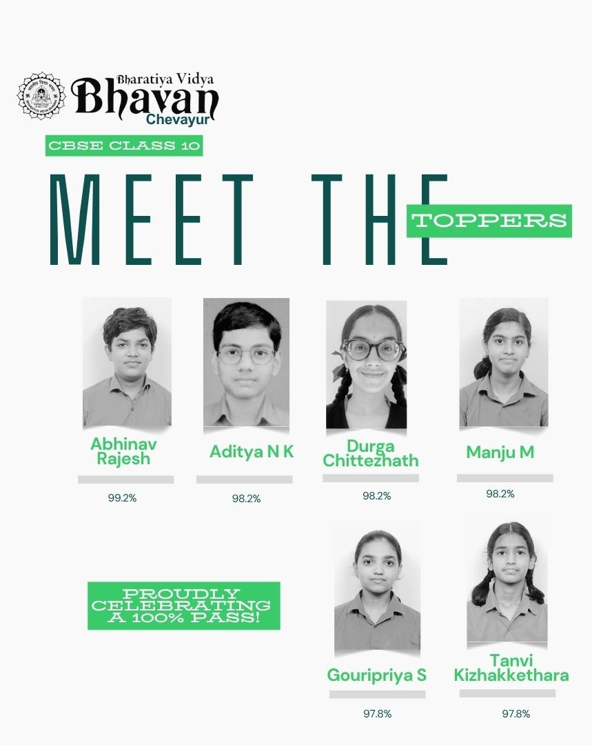 In the SSE - 2025 ABHINAV RAJESH class X emerged as the overall school topper securing a total score of 496 marks out of 500. ADITYA N K, DURGA CHITTEZHATH & MANJU M scored 491 marks out of 500 and GOURI PRIYA S & TANVI KIZHEKKATHARA scored 489 out of 500.